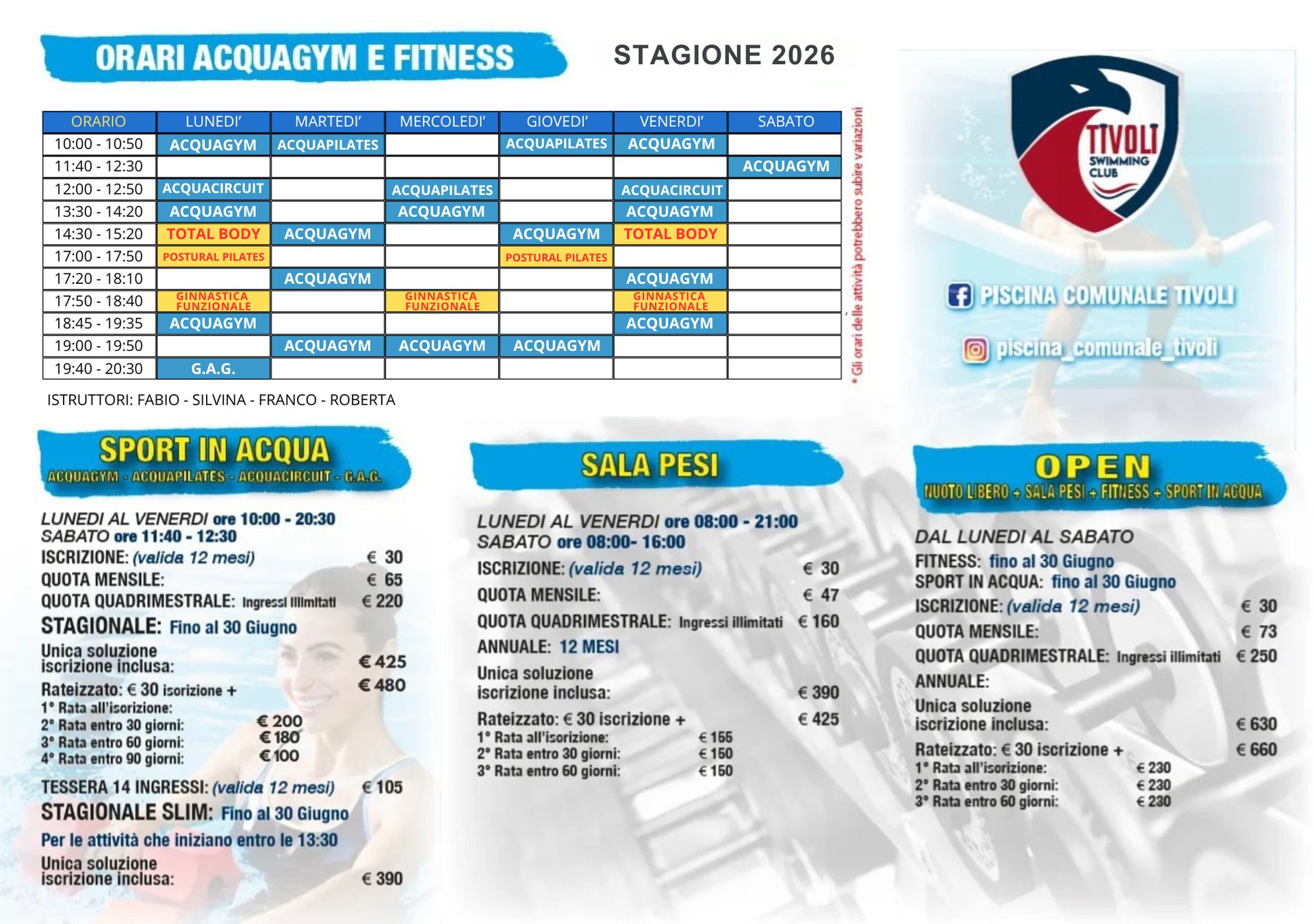 Con il centro sportivo di Tivoli è un importante centro di riferimento per molteplici gare regionali e nazionali di squadre agonistiche di nuoto, squadre di pallanuoto e di nuoto sincronizzato.